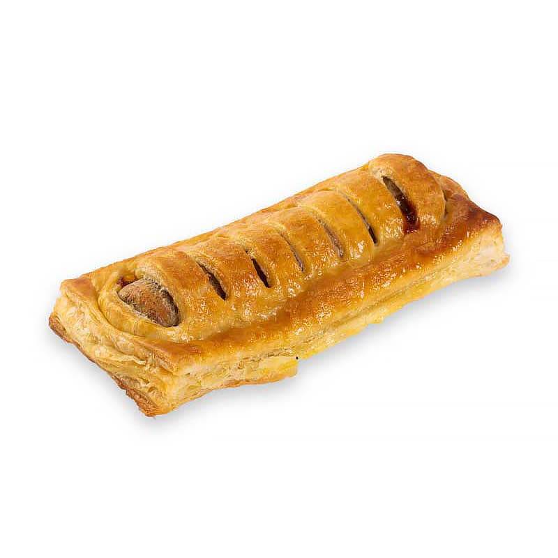 Een hartige snack gemaakt met bladerdeeg en een frikandel met curry in het midden.